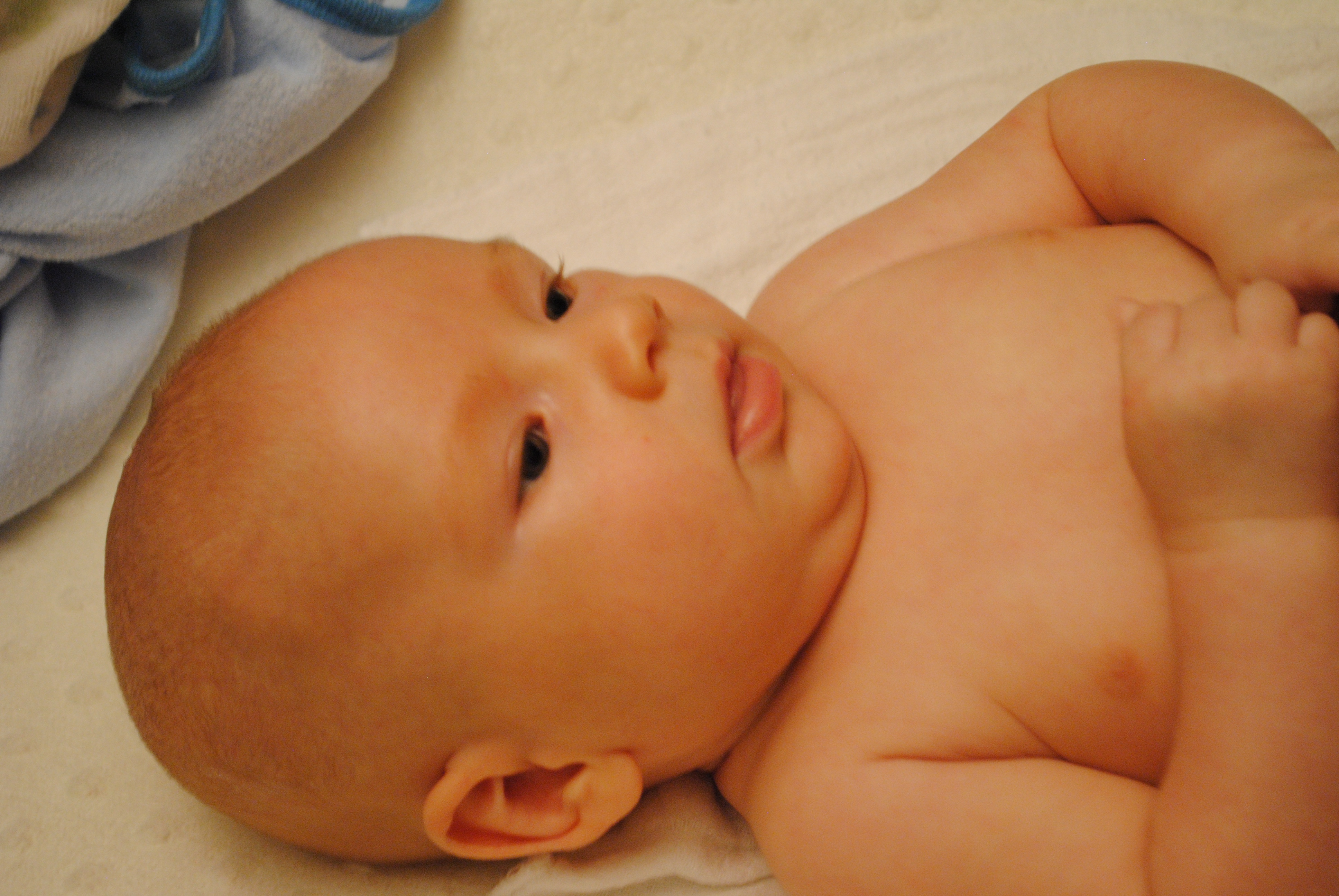 What Riley is up to: Lot’s of chatting! He’s also learned how to hold things. So he’ll grab his shirt or a blanket and hold on. It’s so simple but so adorable. He’s discovered his hands, and they’re pretty much the best toy ever. If he’s awake, 80% of the time his hands are either in his mouth, or he’s clasped them together staring at them. He also likes to wring them together and stare off – sort of like he’s an evil baby genius plotting world domination. Well, at least that’s what it looks like. Bathtime is his favorite thing in the world. Not to be confused with ending bathtime and starting jammie time. That’s the worst time ever. He goes from pure joy splashing in the water to absolutely horrified that we have to remove him from his wonderland and clothe him.