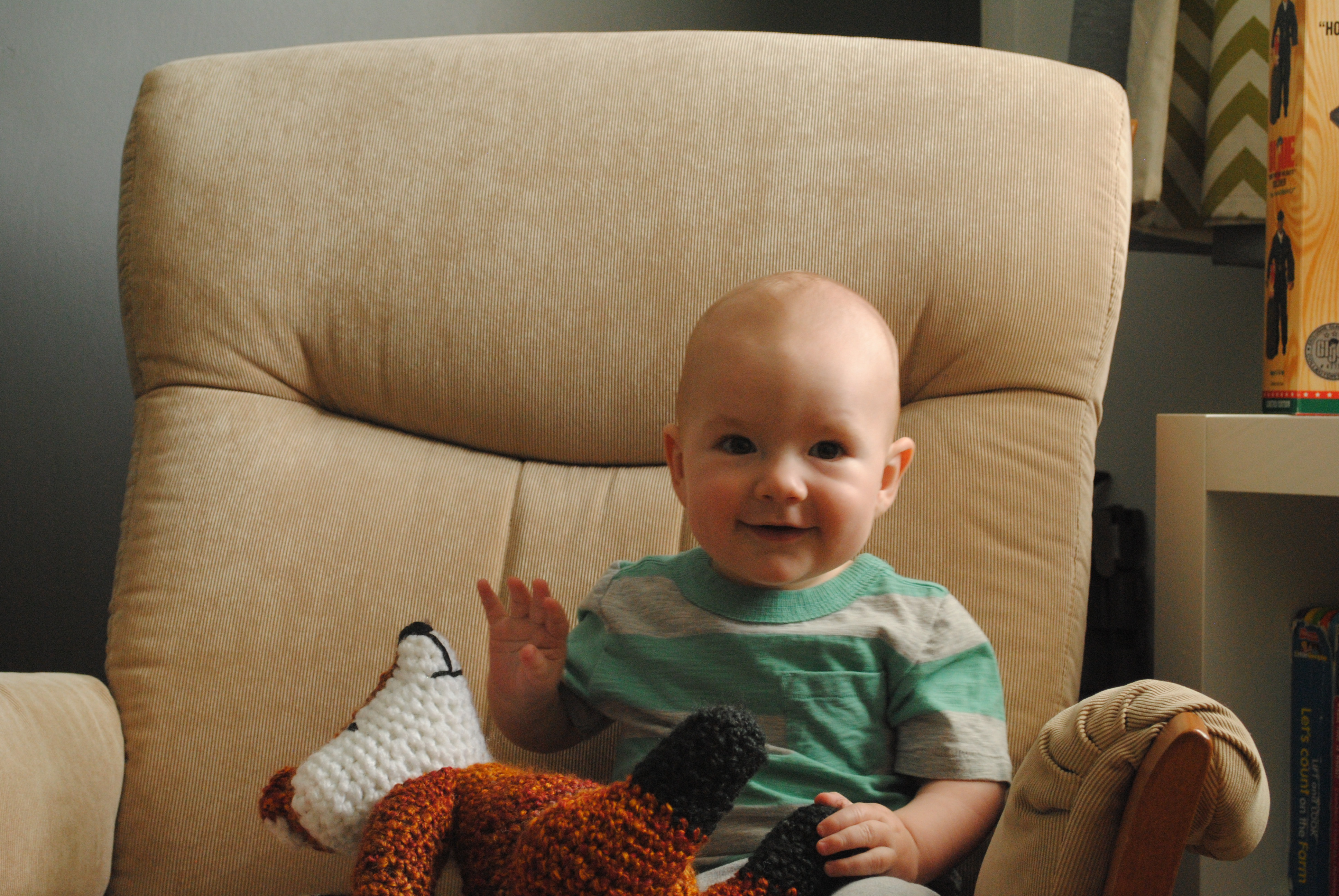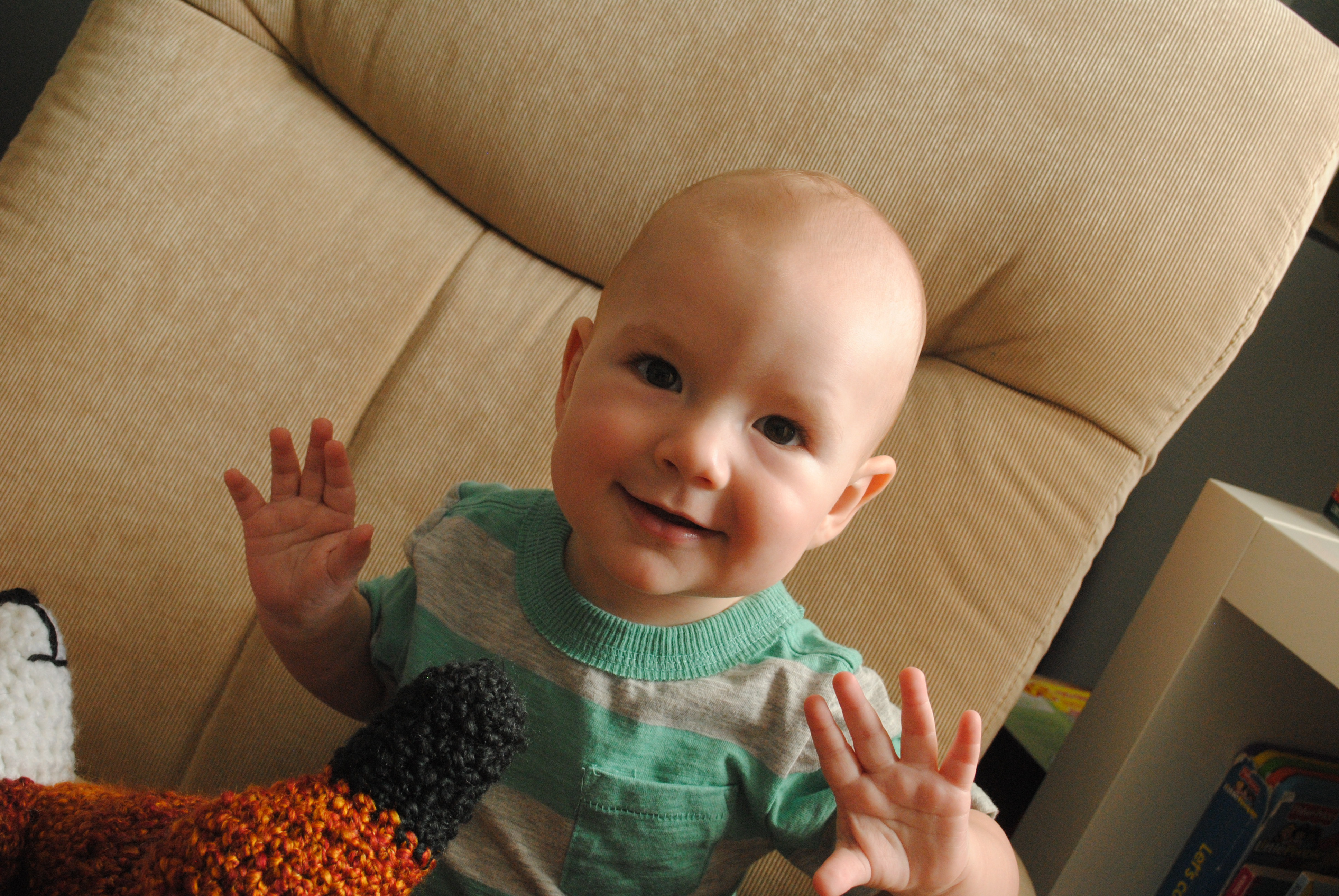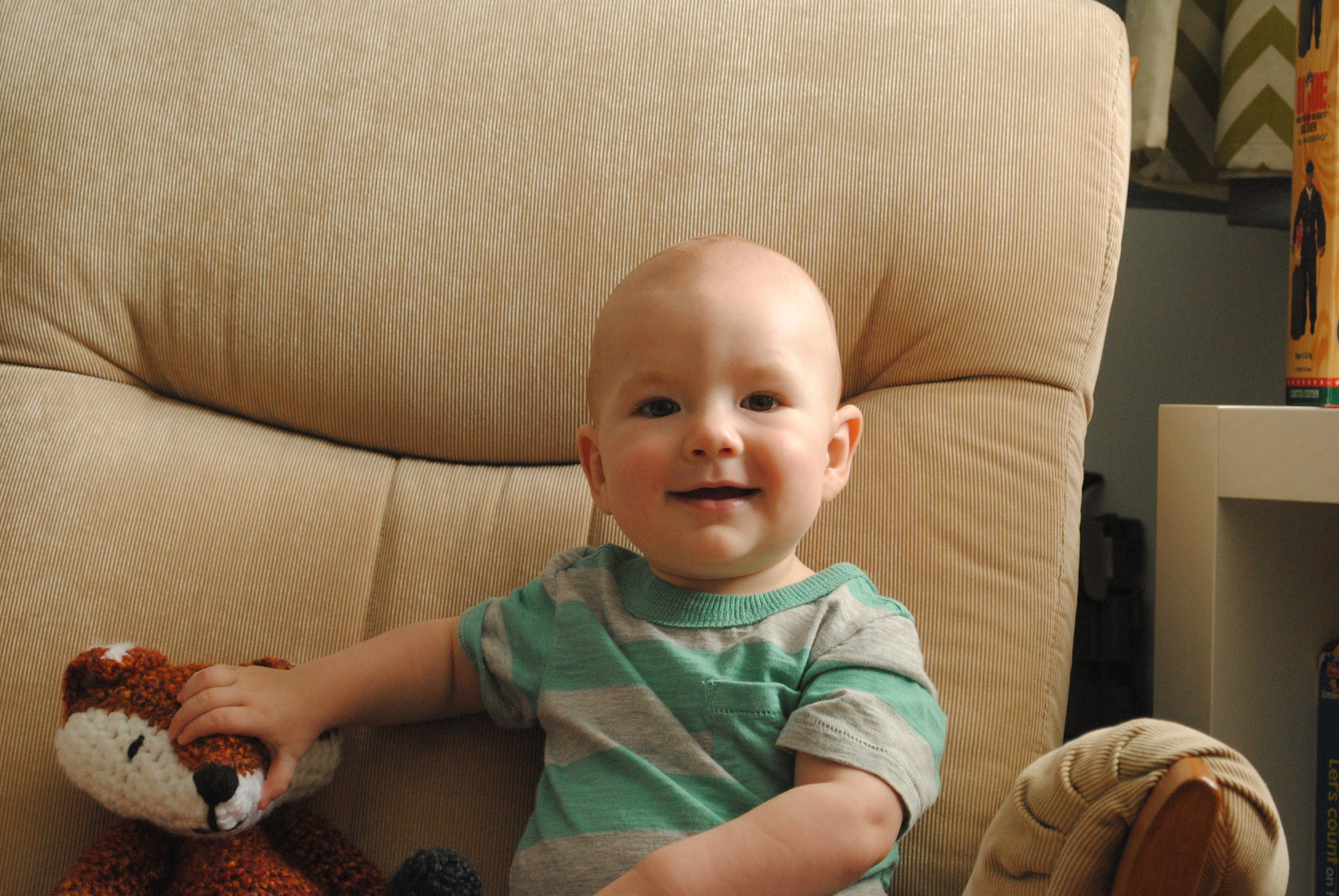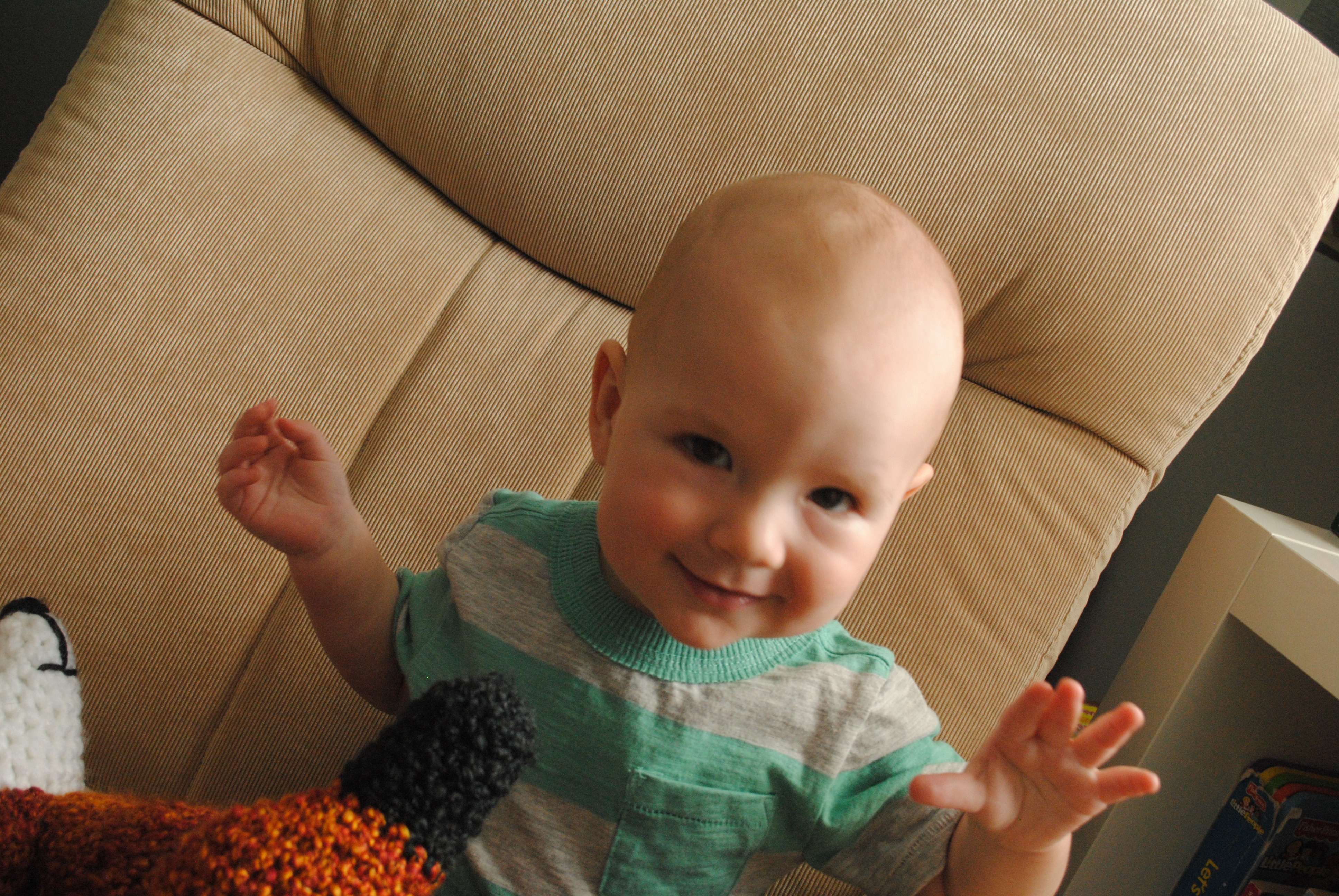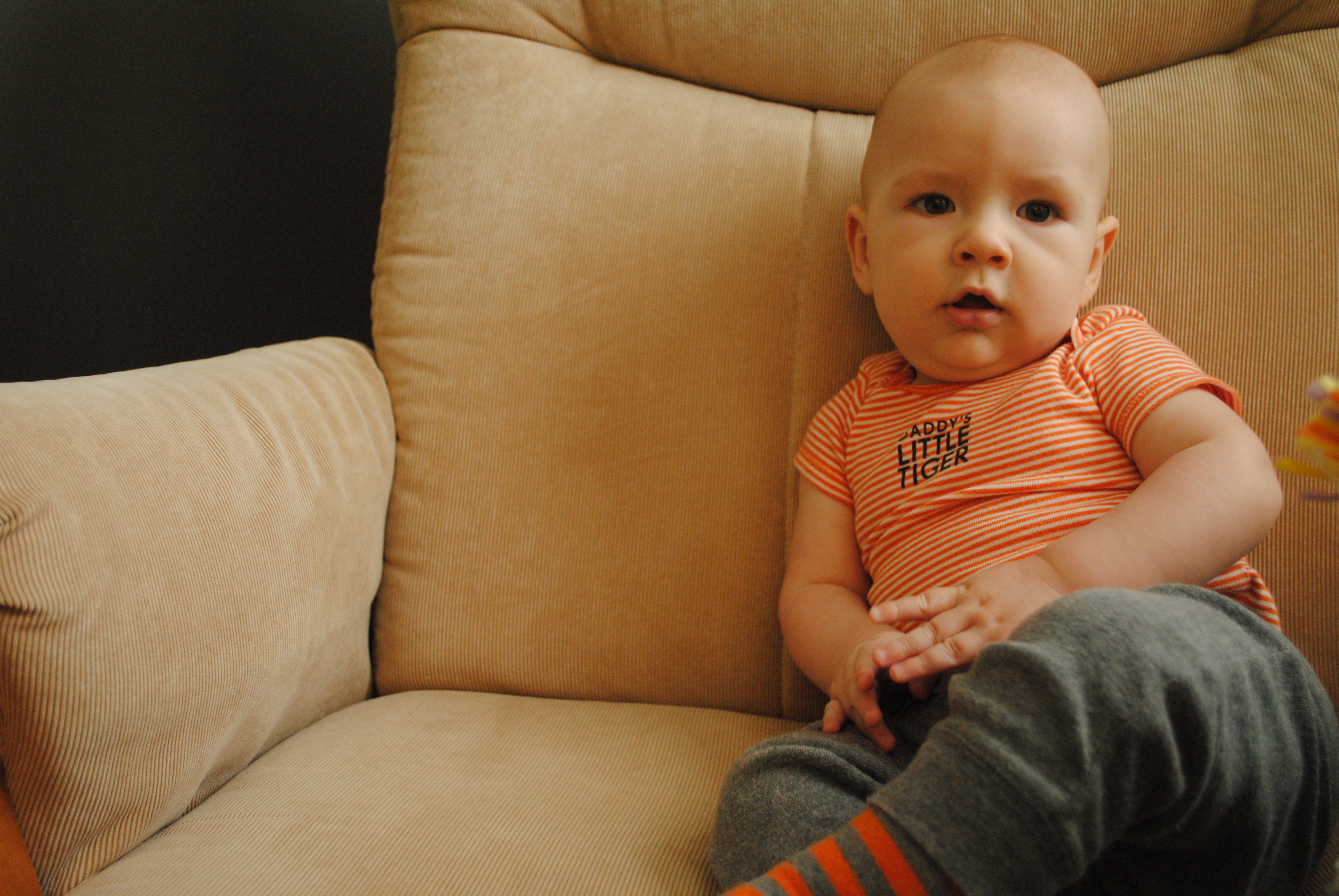 Health: Healthy! We’ve still had some digestive issues, but I think we’re on the downside. We’ve done lots of reading – Dr Sears is my go-to…and we’ve talked to several friends and apparently it’s not uncommon for babies to have trouble with poo. Especially when starting solids. It’s a repetitive cycle: it hurts to go, so baby doesn’t want to go, the longer baby waits the harder it is to go – and it hurts. Over and over. We’ve tried it all: pears, peaches, prunes, apples, water, long baths, tummy rubs, q-tips and glycerin. Finally we shared our frustrations with some friends who’ve had similar issues with their baby – and they found an all natural herbal tea (blue lavender leaves and alfalfa) that helps!!! So I drink the tea, and things get rolling. Whooo! Seriously – most of this month has been spent talking about poo. But, that’s like the deal with parenting, right? How much, how often, color, consistency, frequency…Overall though, he’s super healthy and happy. I totally get that he’s fussy when his tummy is bothering him, wouldn’t you be fussy too?