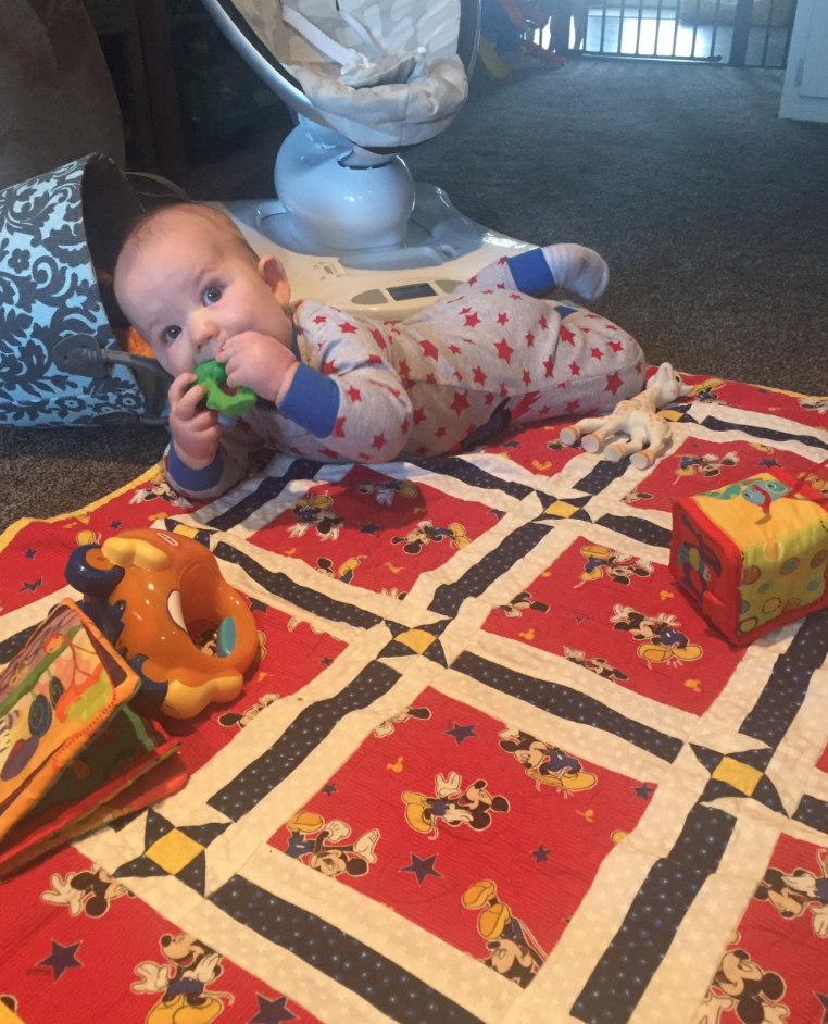 What Charly is up to: We are for sure in the sweet spot. He’s happy and content. He’s sleeping and napping pretty well and can roll around to get to toys he wants to play with. I’m excited for him to sit up, soon I hope. He’s much more of a roller than Riley was. He’s so happy when we go in to get him after a nap, or when he wakes up in the morning. Watching him discover food has been really fun too. He’s generally a really happy, chill and content baby.