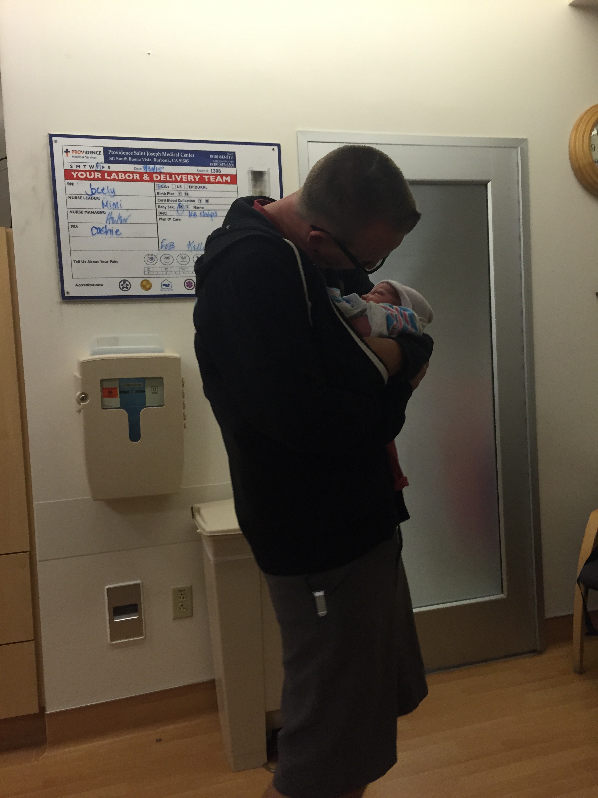 At 6:15pm I got up and started to get ready to leave for the hospital. We only live like 2 blocks away so I took my time. We arrived at admitting at 7:00pm and it was such a strange experience. I walked in and said, “Hi. I’m here to have a baby.” With Riley I was 3 – 4 min apart and we had to go in through ER since the main hospital entrance was closed at 3:30am. This time I walked in with a big group of pregnant couples that were at the hospital for their maternity tour. I wasn’t doubled over in pain or on the verge of throwing up. I waited as they did all my paperwork and gave me my hospital bracelets. We took the elevator up to Labor & Delivery, and then couldn’t figure out how to get the door open. Maybe we should have been escorted? Maybe I should have rode in a wheel chair? I dunno, it was strange. We found the nurses station and they said they’d been expecting me all day!
