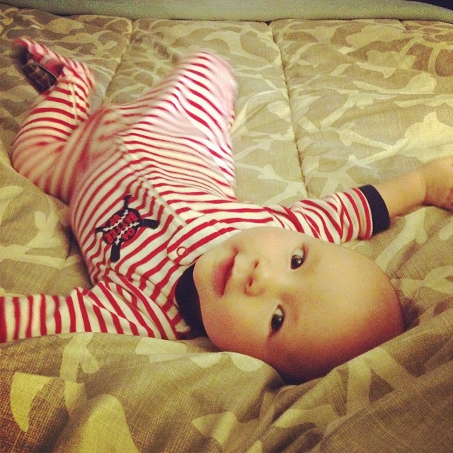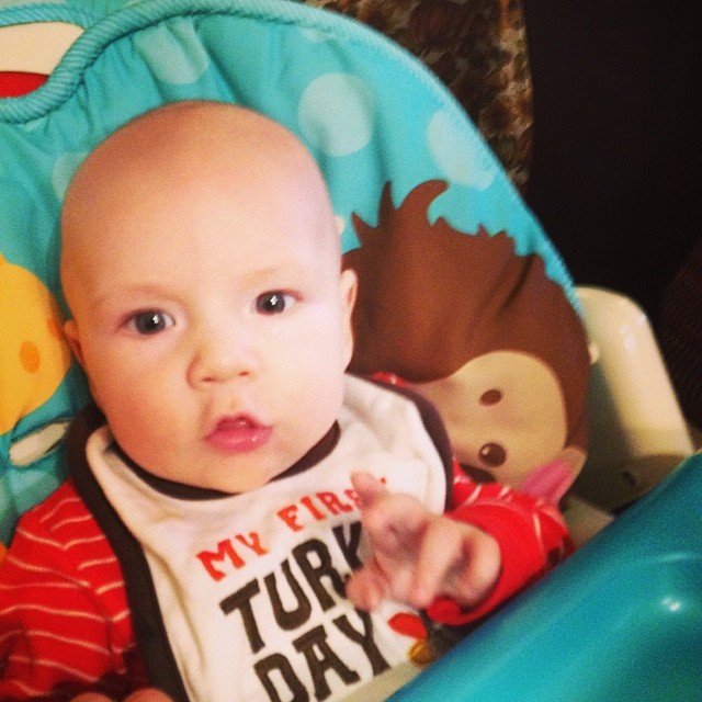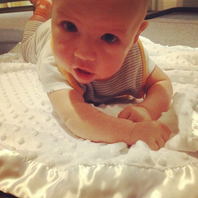 Weight: So…I broke down and bought the word’s cheapest scale. Yea, like you can hardly see what the number is, and when you lean one way or the other it changes. Besides the point – I think he’s between 18 and 19lbs? We’ll get the official weight (and shots. boo.) at his 4 month check up in a few weeks.